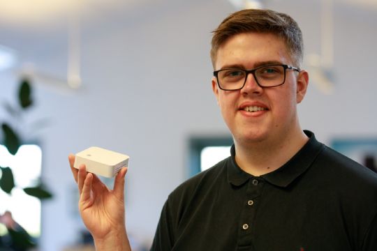 Jonathan Aaris Henningsen med den lille enhed, som styrer systemet.