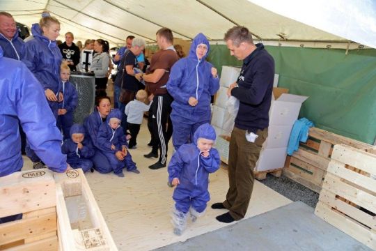 Alle skulle i særlige dragter, inden de blev lukket ind i grisestalden.Grisestalden var åbent og her var der ekstra sikkerhed. Jakker, tasker og sko skulle sættes, før den blå overtræksdragt skulle tages på og lukkes tæt. Mobiltelefoner og kameraer skulle i poser og lukkes til, hvis man ville have dem med ind.