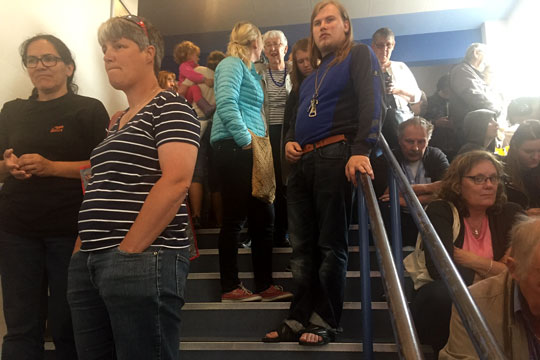 Mange søgte mod Aakirkeby, hvor begge idrætshaller var taget i brug. Flere havde taget opstilling foran dørene i god tid, så der opstod kødannelse – og lidt utålmodighed.
