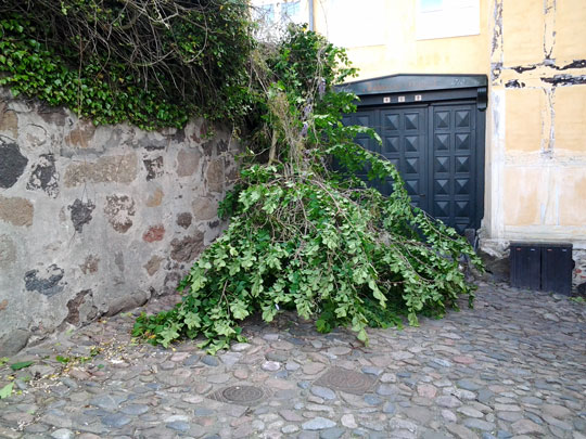 ”Vi blev kaldt ud til en stormskade på Storegade 15 i Rønne, hvor meldingen lød på væltet træ og nødvendigheden af afstivning af en mur.