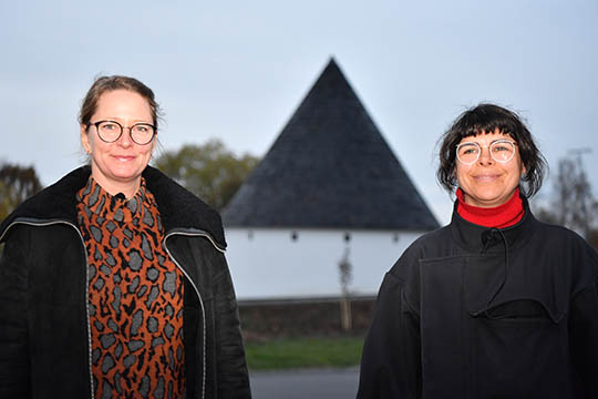 Skulpturen i Vibegårds rundkørsel er skabt af kunstnerduoen Randi Jørgensen og Katrine Malinowsky (t.h.). Foto: Morten BrandborgLang ventetid- Vi er mange, der længe har set frem til, at skulpturen i Vibegårds Runddel skulle stå færdig. Vi har været spændte på, hvordan den egentlig kom til at se ud, denne rundkirkeskulptur.