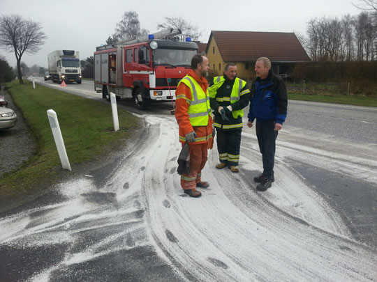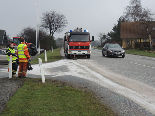 En lastbil spildte torsdag formiddag olie over en længere strækning på Rønnevej mellem Lobbæk og Nylars.