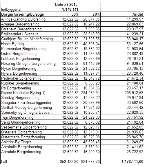 De i alt 1.178.111 kr. fordeles efter en fordelingsnøgle, hvor 30 procent af midlerne fordeles ligeligt mellem alle lokalsamfund med et grundbeløb. De resterende 70 procent af midlerne fordeles efter indbyggertal i de enkelte lokalsamfunds områder.