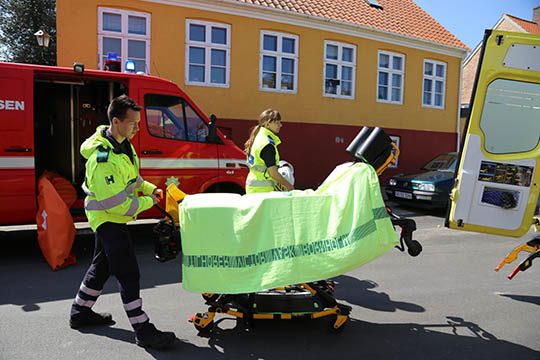 Brandvæsnet blev alarmeret kl. 13:01, og både en brandsprøjte, redningsvogn og en ambulance samt hospitalets akutbil blev sendt til stedet.