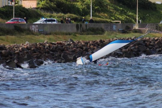 Den lille sejlbåd blev ilde tilredt ved mødet med stenmolen ud for Hotel Griffen. Foto: Presse-fotos.dkDen lille sejlbåd blev skyllet op mod stensætningen ved strandpromenaden.