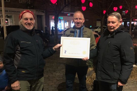 Næstformand Sten Erik Jensen (t.v) og kasserer Nils Pedersen fik prisen på 5.000 kroner overrakt af præsident Benny Schou, Nexø Rotary Klub.