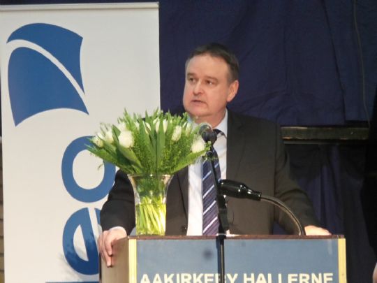 Privatdirektør Tony Gade på talerstolen i Åkirkeby-Hallerne onsdag aften.FORKERTE FAKTA? Bornholm.nu skal ikke offentliggøre faktuelle fejl. Hvis der er noget i denne artikel, du føler er forkert, skal du kontakte os på mail: red@bornholm.nu.