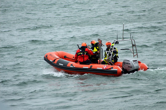 Iført overlevelsesdragt sagde de fleste gæster ja tak til at få en sejltur med gummibåden i havne området og alle blev beriget med en god oplevelse med denne tur.