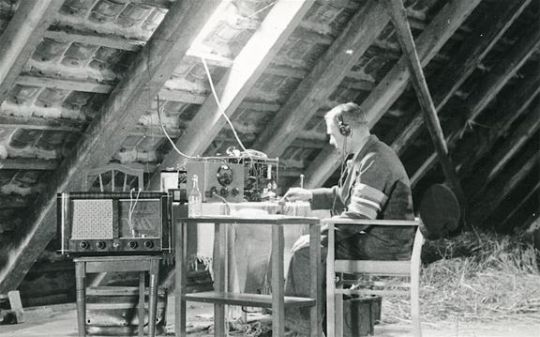 Modstandsbevægelsens radiostation på loftet af præstegården i Nyker. Stationen var i funktion i dagene efter 5. maj 1945. Foto: Frihedsmuseet