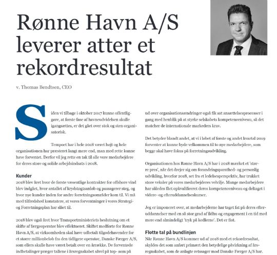I regnskabet for 2018 betegnede Rønne Havn selv overskuddet på 69,4 mio. kr. som rekord.En ledelsesberetning, tidligere kendt som en årsberetning, udgør en væsentlig del af en virksomheds årsrapport. Denne beretning fungerer som en detaljeret uddybning af årsrapportens indhold, hvor den primære opgave er at forklare og analysere virksomhedens økonomiske nøgletal, herunder balance og resultatopgørelse.