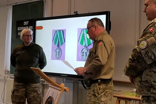 Der var 25 årsmedalje til Ingrid Hansen. Det blev overrakt af kompagnichef Michael Stuhr og chefen for Det Bornholmske Hjemmeværn, oberstløjtnant Holger Fuglsang-Damgaard (t.h.)Kræver manpowerPolitihjemmeværnet regulerer blandt andet trafik til Folkemødet og ved de forskellige sport- og idrætsarrangementer.