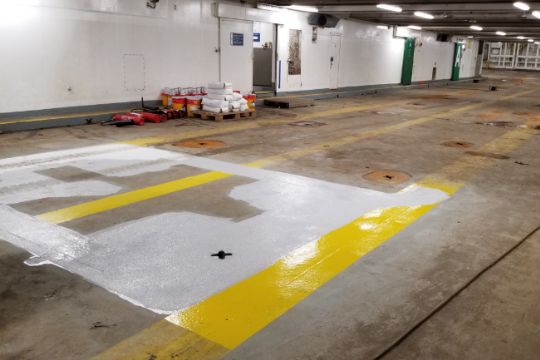 Det var nødvendigt at skære hul i vogndækket flere steder, så de nye generatorer kunne komme ned i maskinrummet. Foto: Bjarne HansenSkibet mere værdDe seneste to år er færgen også indvendig blevet ændret. Blandt andet med nye tæpper og nye møbler.