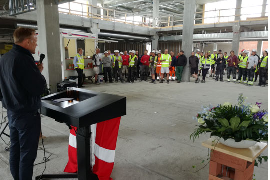 Direktør Mads Kofod talte til de mange håndværkere, som arbejder på opførelsen af Danmarks første rigtige campus.Skal stå klar august 2018Bygningen skal stå færdig til august næste år, hvor eleverne efter planen skal kunne undervises i de nye lokaler.