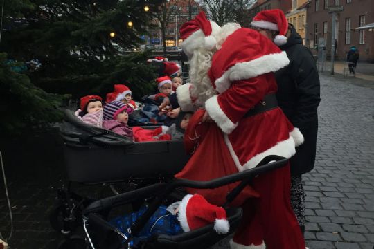 Omkring 110 børn og voksne gik fra Trinbrættet ind til Store Torv med nissehuer på, for at synge julesange og danse om det store juletræ. De mindste havde dog mulighed for at blive kørt.