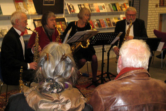 Saxofonkvartetten bestående af set fra venstre Ebbe Torgersen, Lis Pedersen, Margrit Skott og Uffe Nielsen.Bornholms Saxofonkvartet består af Ebbe Torgersen på sopran og altsax, Lis Pedersen altsax, Margrit Skott på barytonsax og Uffe Nielsen, tenorsax.