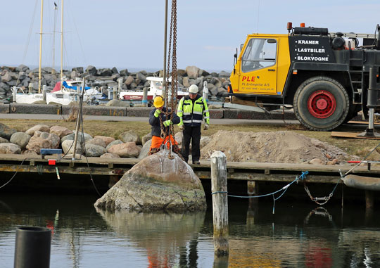RØNNE – En sten med en vægt på 17 tons blev onsdag eftermiddag fjernet fra bassinet i Nørrekås Lystbådehavn.