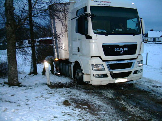 Torsdag gled en stor lastbil i grøften på Savmøllevej i Østermarie, hvor der ikke er blevet saltet eller gruset overhovedet.
