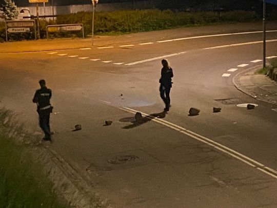 Idet manden gik ud for at fjerne stenene, begynde en person at kaste flasker efter ham.
