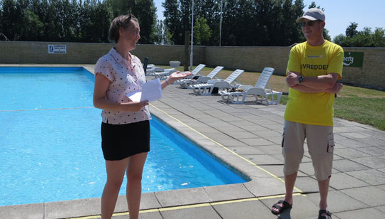 Susie Rømer Rasmussen, TV2 Bornholm, stod for åbningstalen, som blev afsluttet med nedtælling og en tur i poolen sammen med alle børnene.