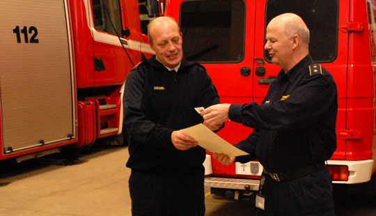 Der var også besøg fra ledelsen i Bornholms Brandvæsen, idet vicebrandinspektør Henrik Brøndbjerg Christensen kiggede forbi for at tildele brandmand Allan Nielsen anciennitetstegn for 10 års tjeneste i brandvæsenet.