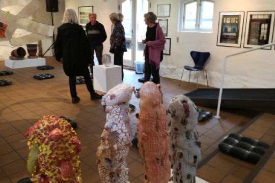 Årets værker blev ivrigt studeret af de indbudte gæster. Fra i morgen kan alle komme.- Der var 87 værker sidste år og 91 i år, og fordelingen mellem antal værker på vægge og gulv er nogenlunde den samme. Men i år ser jeg en harmonisk og ret rolig udstilling med et par kraftige spark i bolledejen ind imellem, sagde Vibeke Eskesen i åbningstalen.