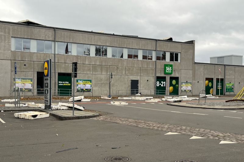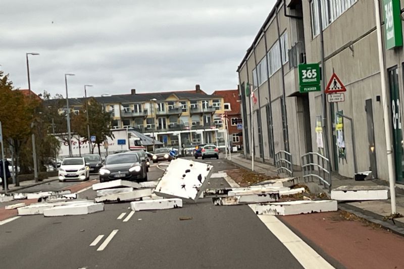 NEXØ - Det blæser så kraftigt i Nexø, at der blæser tagplader af på det store bolighus Inhouse i Nexø og ved COOP 365.