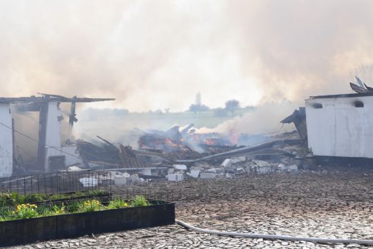 Da de første brandbiler ankom, væltede der røg ud fra bygningerne. To længer er nedbrændt.