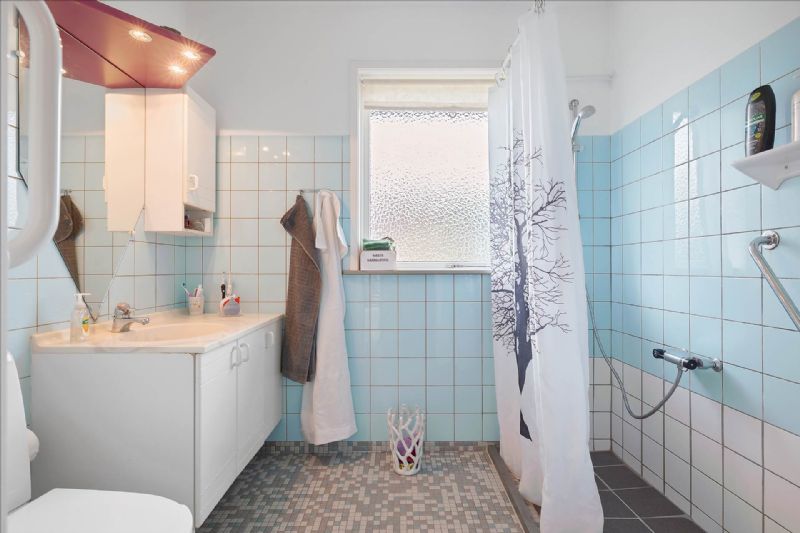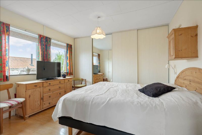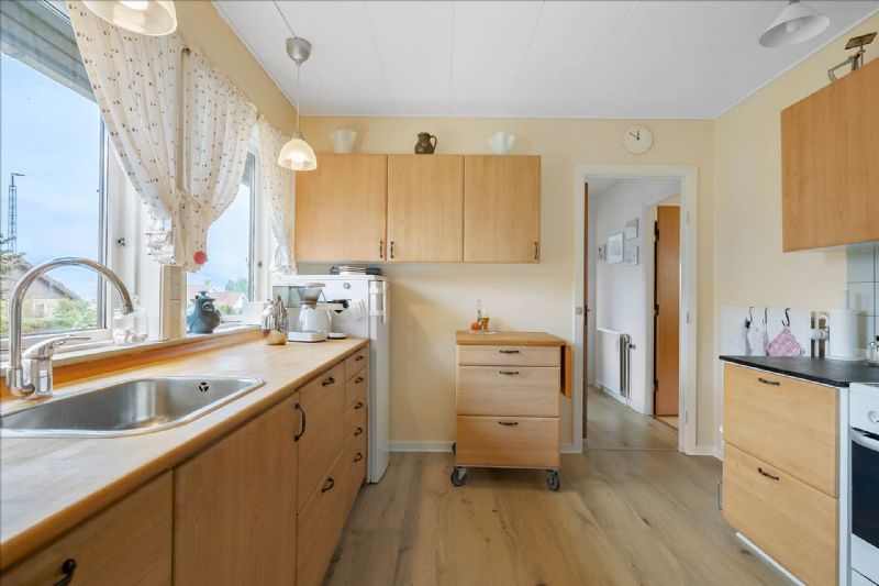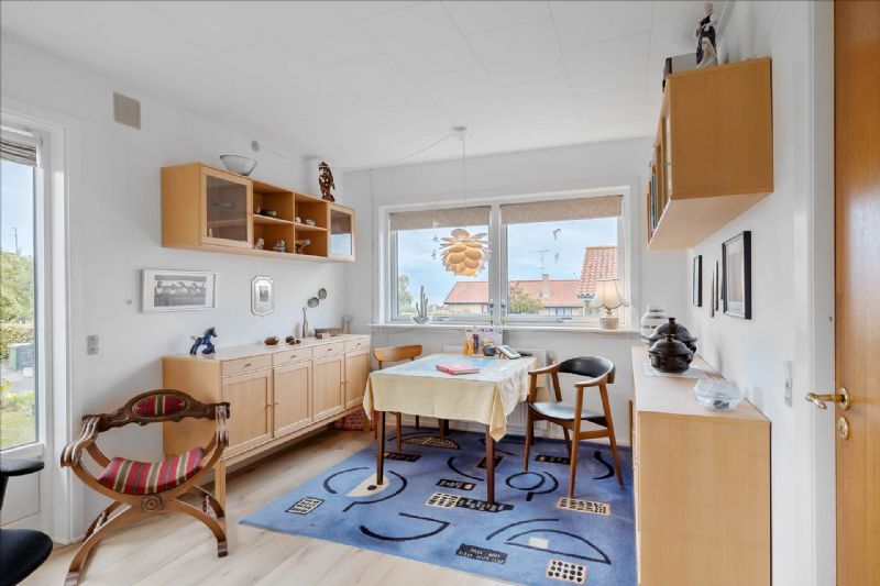 Indendørs byder villaen på en velovervejet og funktionel planløsning, der omfatter en række attraktive elementer. Fra et rummeligt bryggers med vaskemaskine, skabe og fjernvarmeinstallation, til et indbydende spisekøkken udstyret med moderne hvidevarer, fremstår hver del af huset både praktisk og stilfuld. Ejendommen byder også på et flisebadeværelse med alle nødvendige faciliteter, en spisestue med udsigt til havet, og et stort værelse med indbyggede skabe.