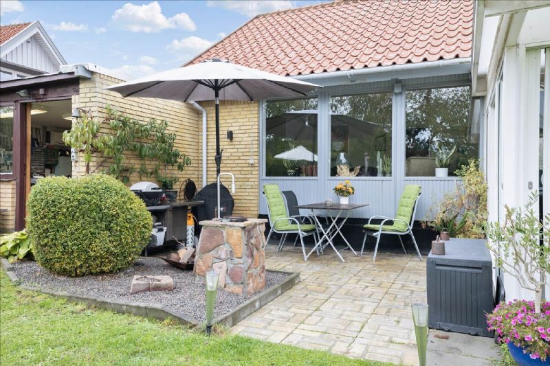 Grunden, der omgiver ejendommen, er velanlagt og indeholder en række faciliteter der understreger ejendommens charme. Dette inkluderer en praktisk parkeringsplads, en carport, samt adskillige solterrasser perfekt til udendørs afslapning. Den velplejede græsplæne, komplet med moden beplantning og frugttræer, tilføjer et naturligt element til ejendommen.