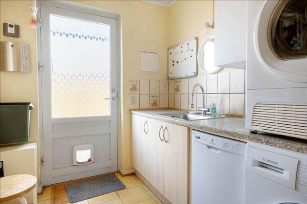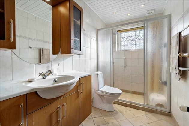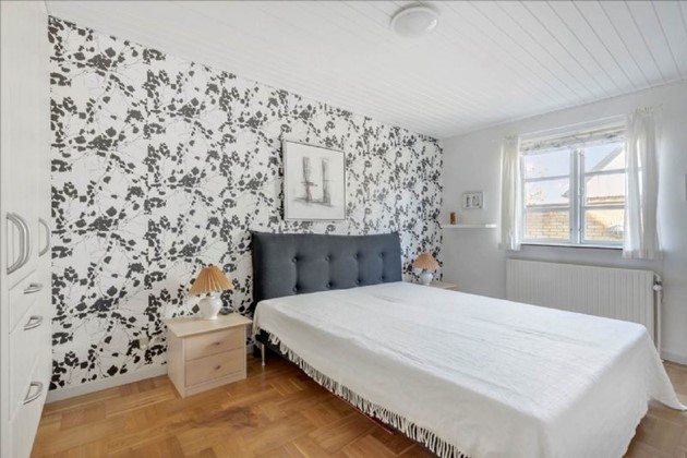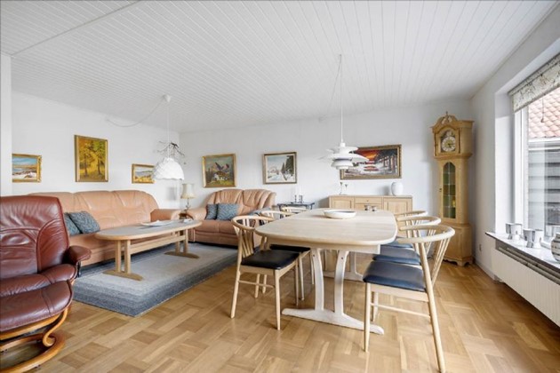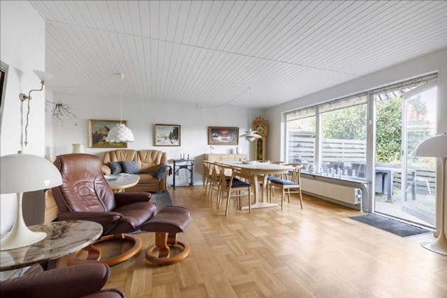 Boligen, der ligger i ét plan, består af en entré med skabe, et lyst spisekøkken, et bryggers med vaskemaskine, tørretumbler og fjernvarmeunit, samt en rummelig vinkelstue med trægulv og udgang til terrassen. Desuden byder huset på to store værelser med indbyggede skabe og et pænt flisebadeværelse med gulvvarme.