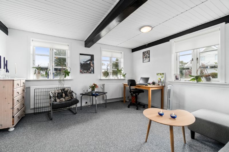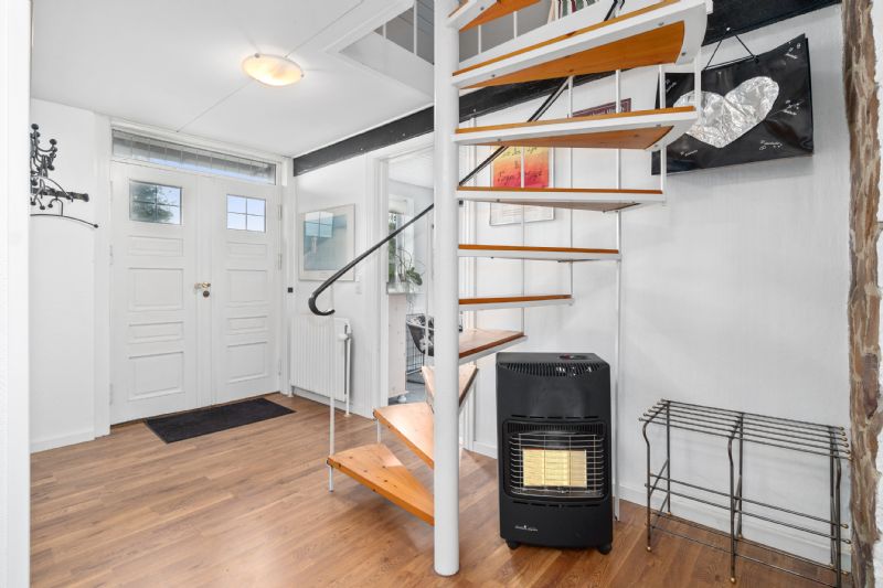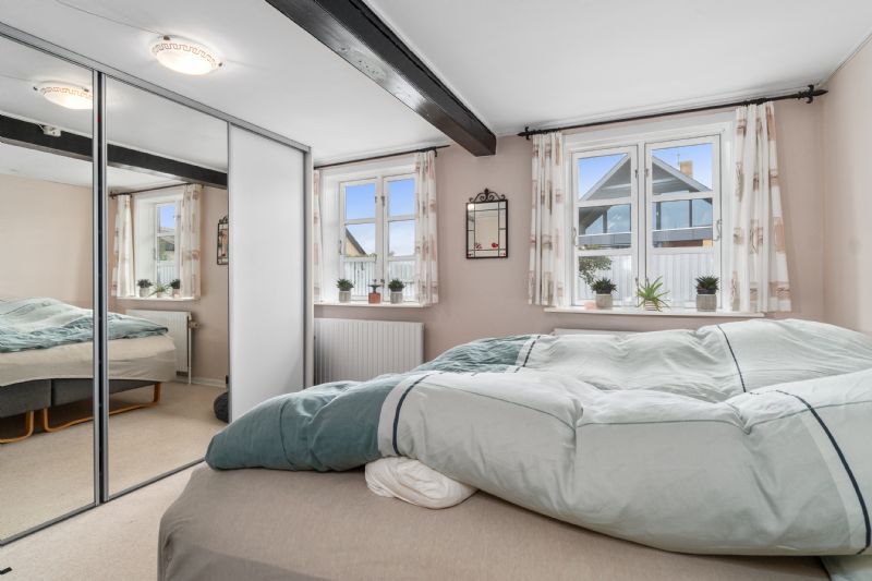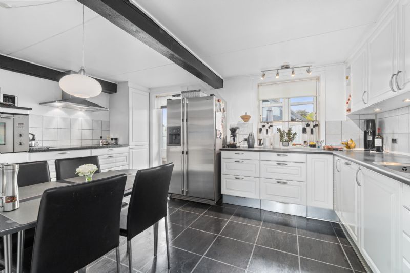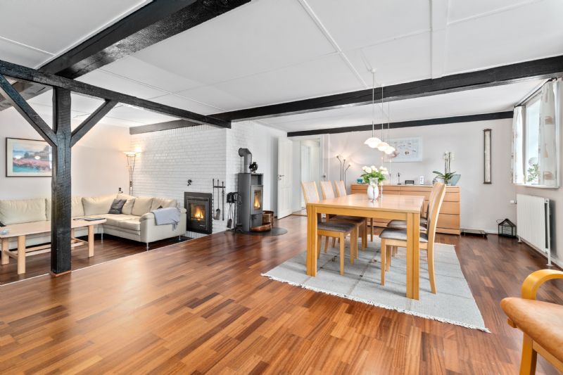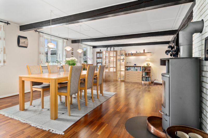 Det er svært ikke at blive forelsket i stuen, hvor fritlagte bjælker og to brændeovne skaber en hyggelig og varm atmosfære. Stuen er opdelt i to niveauer, hvilket giver rummet karakter og dybde. Køkken-alrummet er en fryd for øjet, præsenteret i et tidløst design med hvide fronter, moderne induktionskogeplade, og en ovn placeret i en ergonomisk højde.