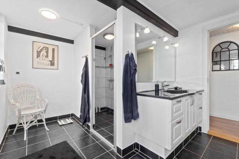 På stueplan findes to af de i alt fire værelser samt et af badeværelserne. Begge værelser er indrettet med faste skabe, og det ene værelse er endda todelt, hvilket giver ekstra plads og muligheder. Badeværelset på stueplan er en oase med gulvvarme og en luksuriøs dobbelt bruser. Designelementerne fra Svane fortsætter her, hvilket sikrer et sammenhængende og stilrent udtryk i hele boligen.