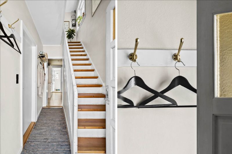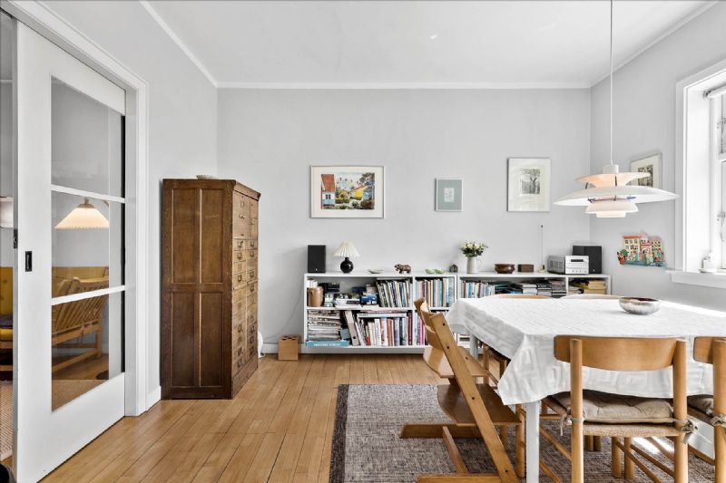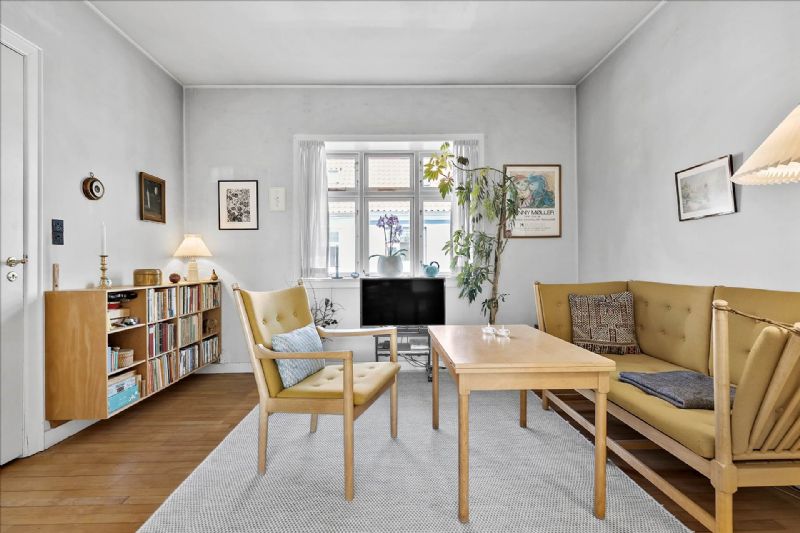 Ejendommen indeholder entré med god trappe til 1.sal, køkken med udgang til have samt nedgang til kælder, spisestue med trægulv, brændeovn og kig til haven, stue med trægulv og skydedør til spisestue.