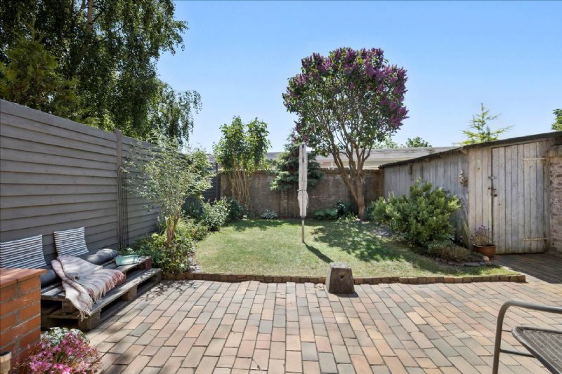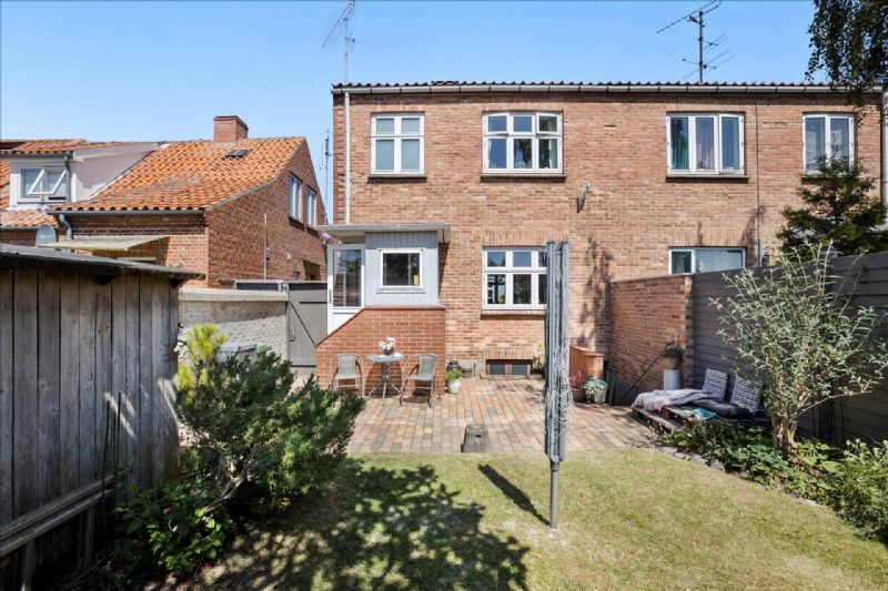 Grunden er anlagt med gænge indtil en skøn og sydvendt gårdhave. Derudover er der opført et skur til cykel og haveredskaber.