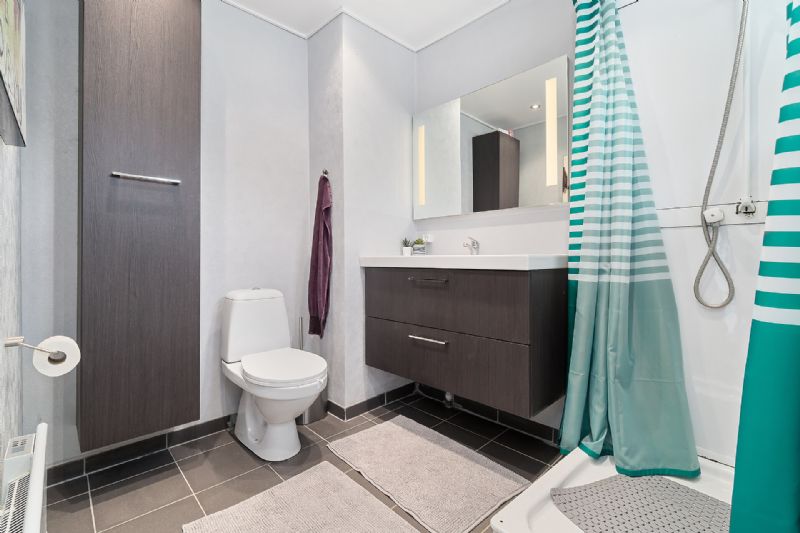 Stueplanet har badeværelse, bryggers med gulvvarme og et stort soveværelse med havedør.