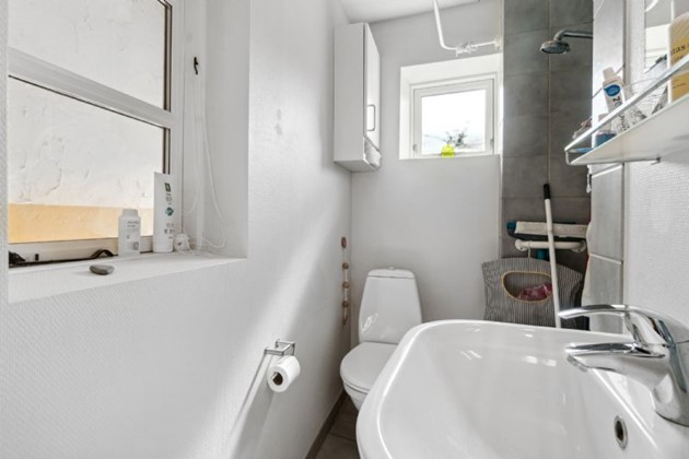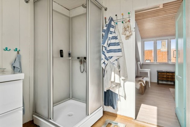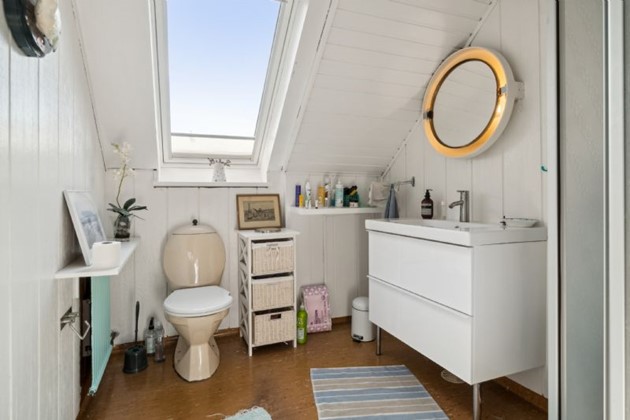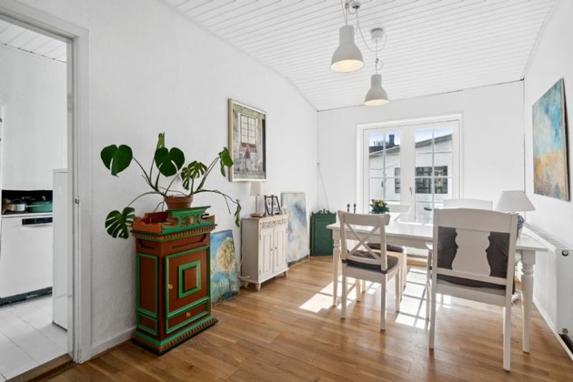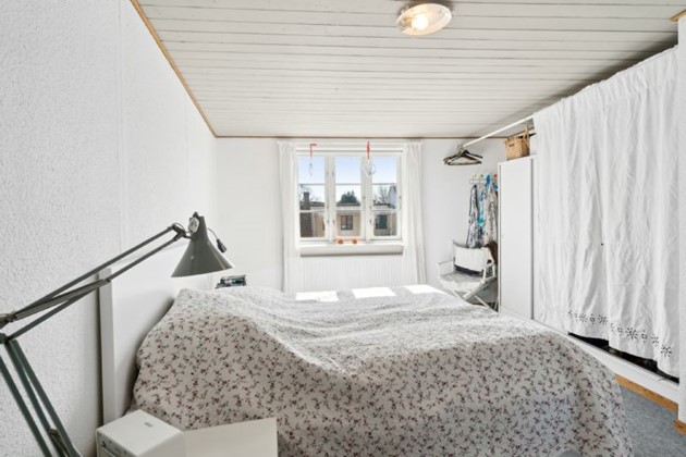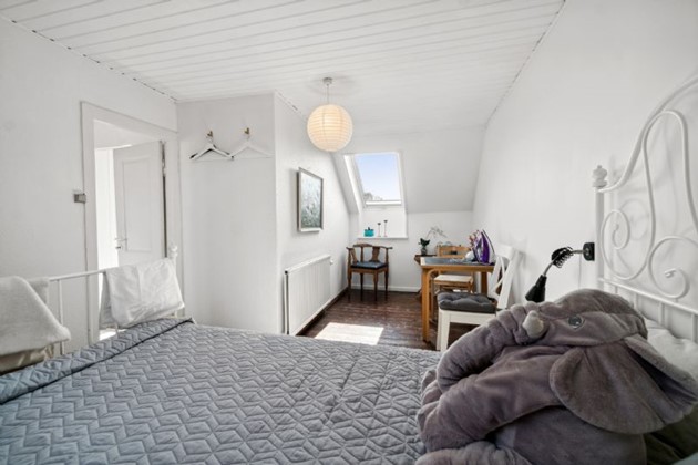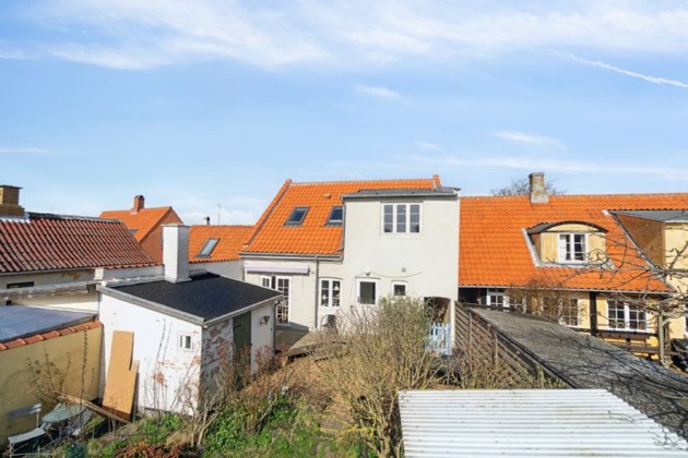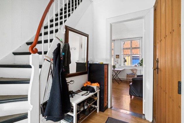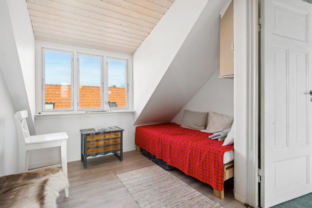 På første sal finder man et stort, lyst soveværelse, der byder på en næsten sydlandsk udsigt over de omkringliggende gårdhaver og byens tage, helt til kirkens spir. Et yderligere rummeligt værelse med tagvinduer og et repos med udsyn over gaden og til den historiske Erichsens Gård fuldender billedet af et hjem, der er både rummeligt og hyggeligt.