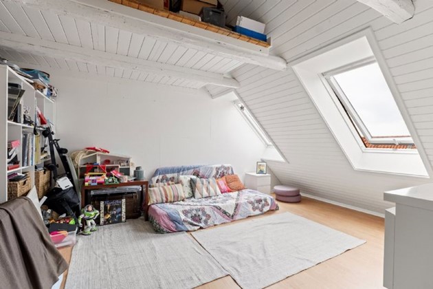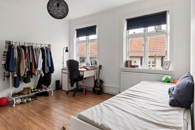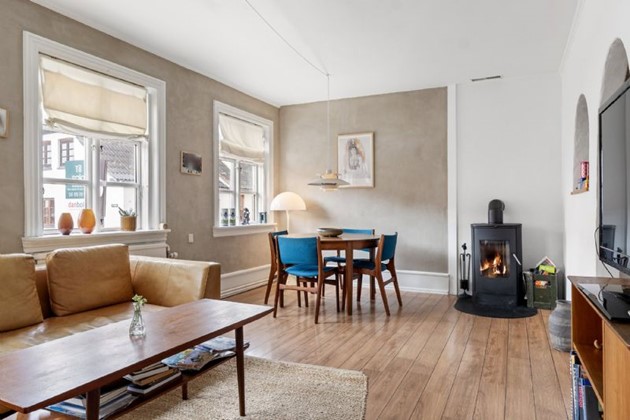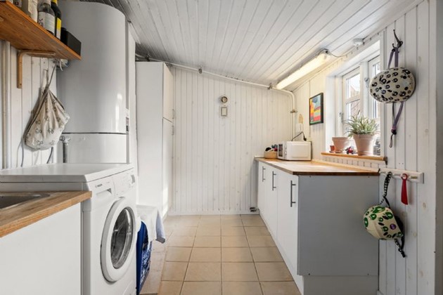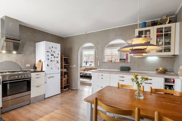 Indenfor fremstår boligen lys og indbydende med entré, badeværelse med separat brus, bryggers med vaskefaciliteter, fire værelser samt et opholdsrum, hvor køkken og stue er forbundet i et åbent og funktionelt miljø. Køkkenet er opført i tidløse elementer med alle nødvendige hårde hvidevarer, og smukke hvælvinger skaber sammenhæng til det kombinerede stuemiljø.
