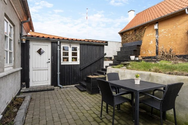 Grunden måler 203 m², og bag huset findes en østvendt, niveaudelt have med både stor fliseterrasse og hævet græsareal med træterrasse. Haven byder på havudsigt og morgensol, og et 10 m² udhus giver ekstra opbevaringsplads.