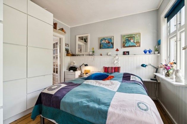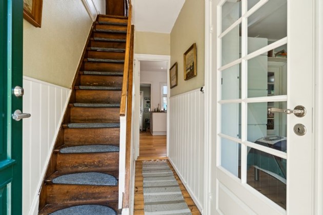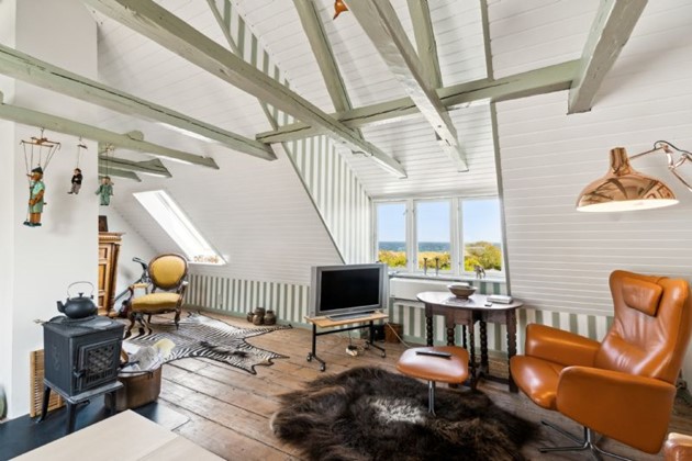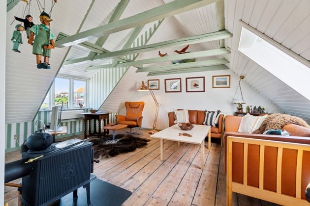 I stueplan finder man to anvendelige værelser og et badeværelse, mens førstesalen imponerer med en stor opholdsstue med loft til kip og fritlagte bjælker, som tilføjer ekstra charme.