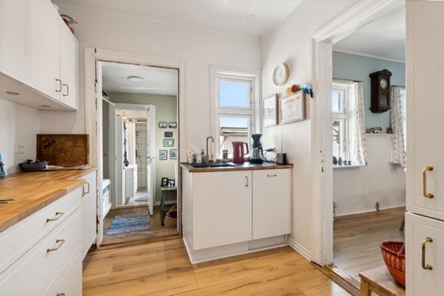 Indenfor byder huset på en spændende planløsning med to værelser, to opholdsstuer og et badeværelse. Tag, vinduer og køkken er af nyere dato, og boligen er yderst velholdt.
