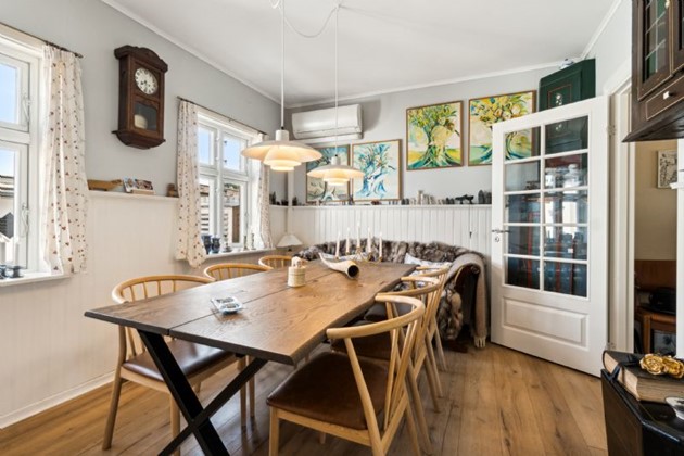 Den rummelige spisestue med sin hyggelige atmosfære og brændeovn er perfekt til afslappede stunder. Køkkenet, der ligger i åben forbindelse med spisestuen, fremstår moderne og funktionelt med hvide elementer.
