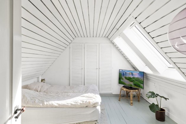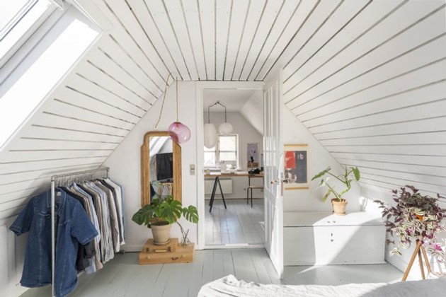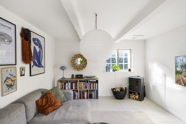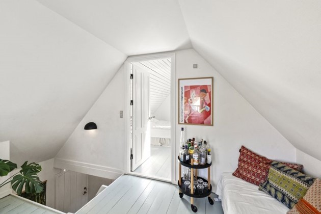 Stuen er rummelig og lys, med store vinduer og en brændeovn, som gør det til et ideelt sted at samles til hverdag og fest. Førstesalen byder på et rummeligt gennemgangsværelse, der kan indrettes efter behov som ekstra stue, kontor eller legerum, samt et soveværelse med indbygget skabsvæg. De synlige træbjælker og de skrå vægge giver et romantisk præg og skaber en særlig hyggelig atmosfære.