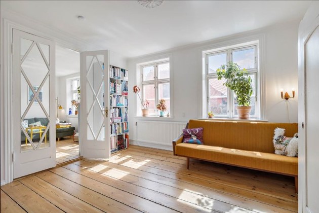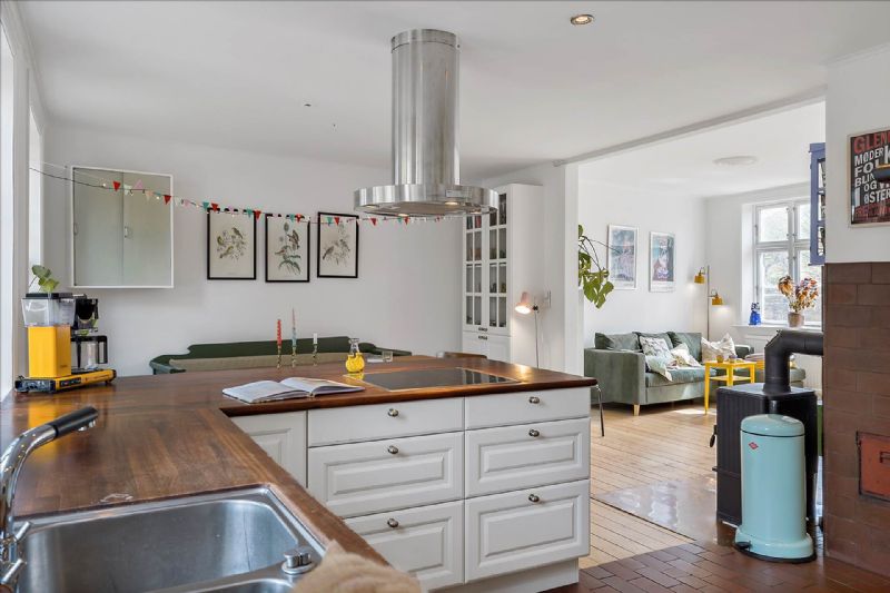 Indvendigt byder huset på en blanding af traditionelle elementer og moderne faciliteter. Franske døre, originale trægulve og stuk bidrager til en herskabelig atmosfære, mens køkkenalrummet, udstyret med moderne hvidevarer og en brændeovn, tilføjer et strejf af nutidens bekvemmeligheder.