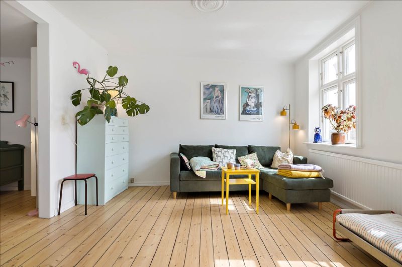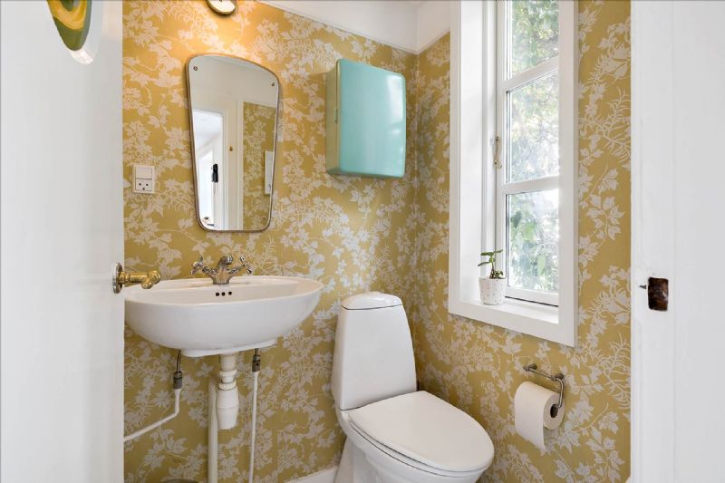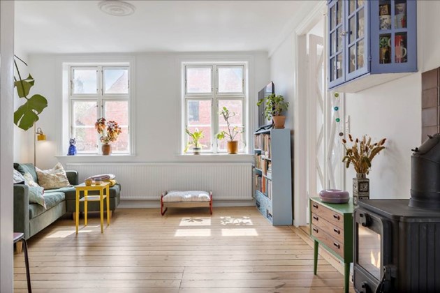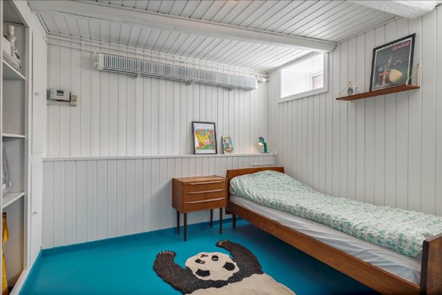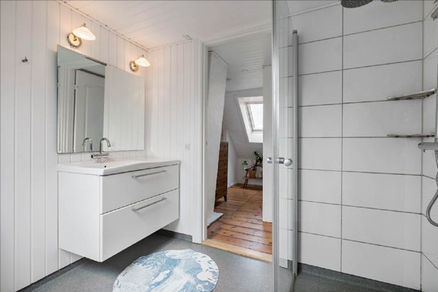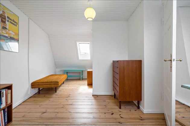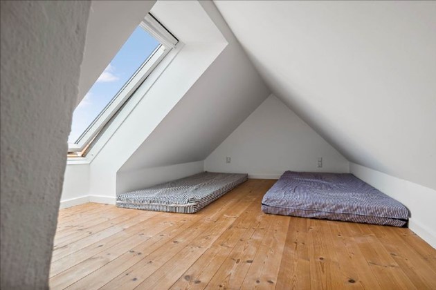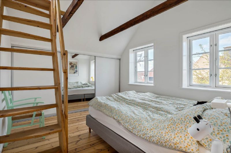 På første sal fortsætter charmen med høje lofter, synlige bjælker og indbyggede skydedørsskabe i soveværelset. Et andet soveværelse nyder godt af naturligt lys fra to store vinduer, mens det rummelige badeværelse kompletterer øverste niveau med toilet, håndvask og bruseniche.