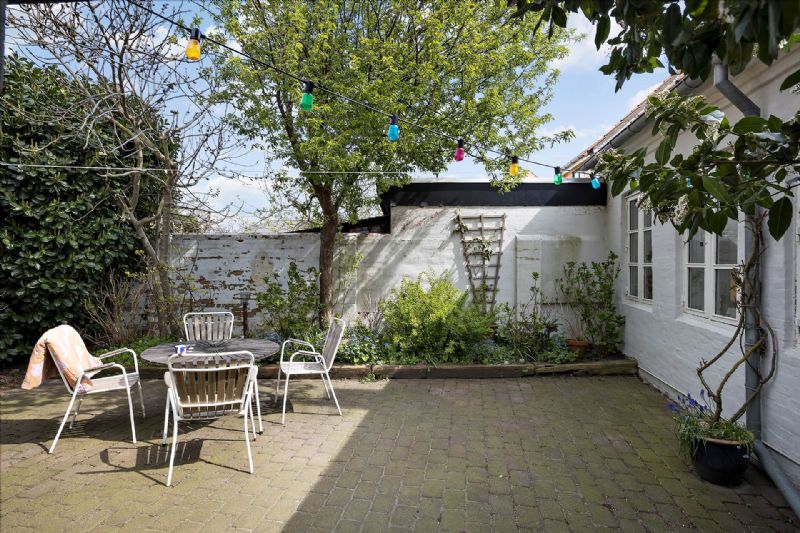Udenfor danner den private gårdhave en fredfyldt oase med flisebelægning og figentræer, ideel til udendørs afslapning eller sociale sammenkomster.