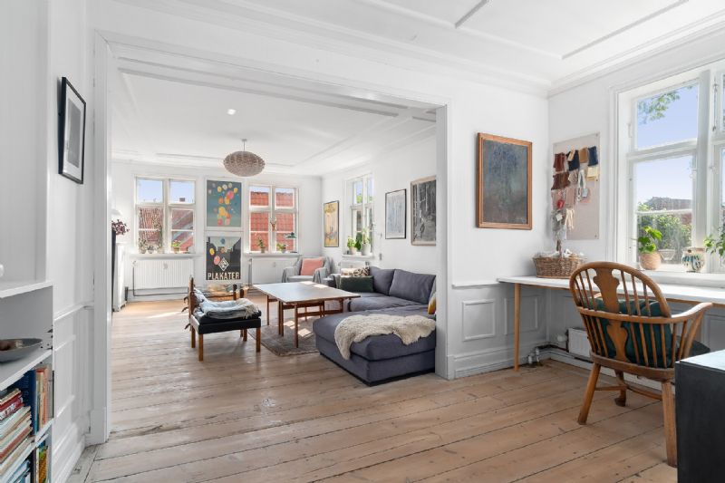 Den første del af boligen består af tre stuer og fire værelser foruden et badeværelse med badekar samt originalt snedkerkøkken og et gæstetoilet.