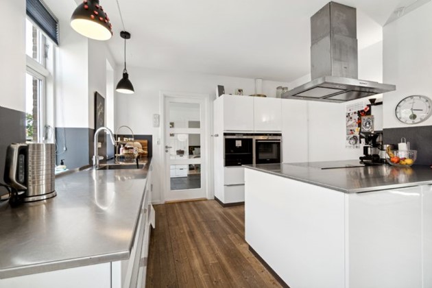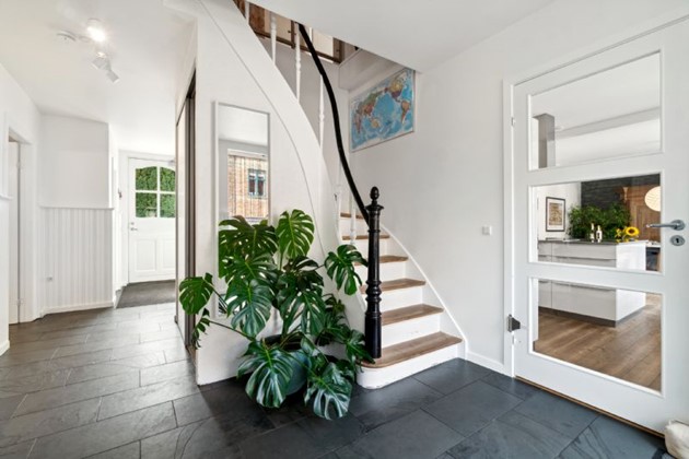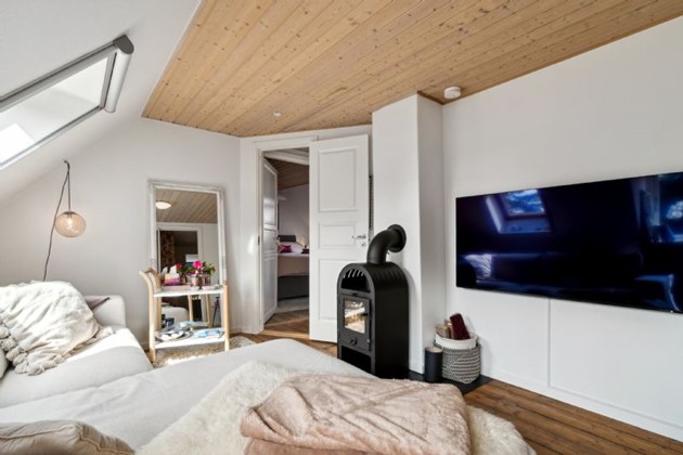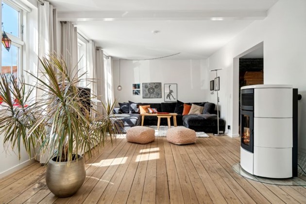 Når man træder ind i boligen, mødes man af en lys og indbydende entré med en elegant, svungen trappe, der forbinder til den skønne gårdhave, hvilket straks skaber en følelse af sammenhæng mellem inde og ude. Glasdøren fører ind til boligens hjerte – det åbne køkken-alrum og stuen, som er i et sammenhængende rumforløb. Køkkenet imponerer med hvide elementer og kvalitetsudstyr, herunder en integreret kaffemaskine, der gør hverdagen lidt mere luksuriøs. Stuen er et hyggeligt samlingspunkt med en pillebrændeovn, der sikrer varme og stemning på kølige aftener.