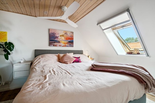 Stueetagen rummer også et moderne badeværelse med glasafskærmet bruseniche samt to rummelige værelser. På førstesalen venter yderligere fire værelser, som kan indrettes til børneværelser, kontor eller måske endda et walk-in-closet – mulighederne er mange. Fælles for hele huset er det gavmilde lysindfald, som skaber en behagelig og lys atmosfære dagen lang.