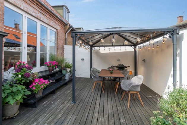 Den lukkede gårdhave fungerer som en fredfyldt oase, hvor man kan nyde privatliv og ro. Selvom gårdhaven er kompakt, føles den rummelig med plads til både leg og afslapning. Her kan sommeraftenerne nydes under pergolaen, mens børnene leger i haven. Som en ekstra bonus byder kælderen på et praktisk bryggers og et opvarmet rum, der kan bruges til opbevaring, hobbyrum eller noget helt tredje.