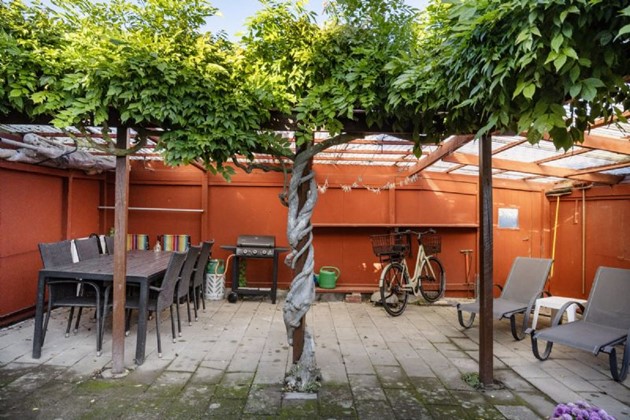 Udenfor strækker en stor have sig med frodige espalier og flere solrige lækroge, ideelle til afslappende stunder. Terrassen er det perfekte sted til at nyde udendørslivet, omgivet af farverige buske og blomsterbede, og skaber en afskærmet oase, hvor fred og idyl kan nydes i fulde drag.